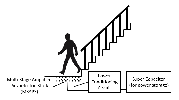 The proposed floor tile energy harvester can be placed on the ground as a regular floor tile would be, but has the ability to capture the kinetic energy carried in a footstep and convert that energy into electric power. This device can act as a localized energy source, which can be used to power nearby electronic devices. Ultimately, the energy harvesting system includes a power conditioning unit and a super capacitor in order to store the generated electric power, as shown in Figure 1.