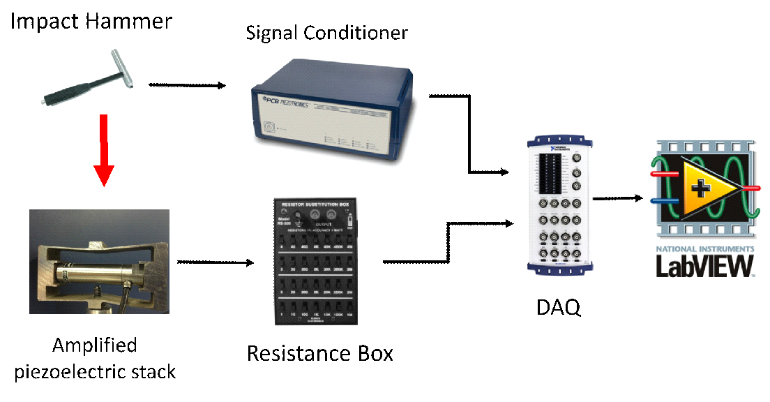 The voltage output of the stack is obtained through a resistive load and acquired by the DAQ board. In the same manner, the applied force is measured by the hammer’s force sensor as a voltage signal, which is processed through the signal conditioner and acquired by the DAQ board. The actual force is determined by dividing the output voltage by a factor of 2.25 mV/N as indicated by the hammer’s manufacturer [10]. A photographic and schematic representation of the test setup appears in Figures 10 and 11, respectively.