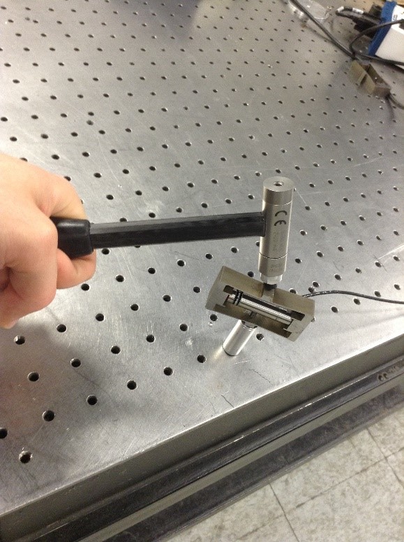 The experiment consists of striking the top of the amplification frame or stack with a vertical motion using the impact hammer, as shown in Figure 12. The setup allows the voltage output of the piezoelectric stack to be related to the force applied with the hammer. Raw data of each test run is recorded with LabVIEW at a sample rate of 1 kHz for a duration of 1 second.