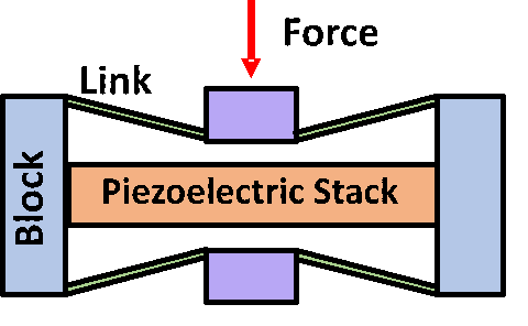 The frame ensures that the input load is always applied indirectly onto the stack in a predictable manner and in an axial direction. Guaranteeing that strain occurs axially in the active direction of the stack prevents shear (piezoceramics tend to be brittle) and maximizes energy conversion by having the mechanical deformation occur in the direction of the generated electric field.