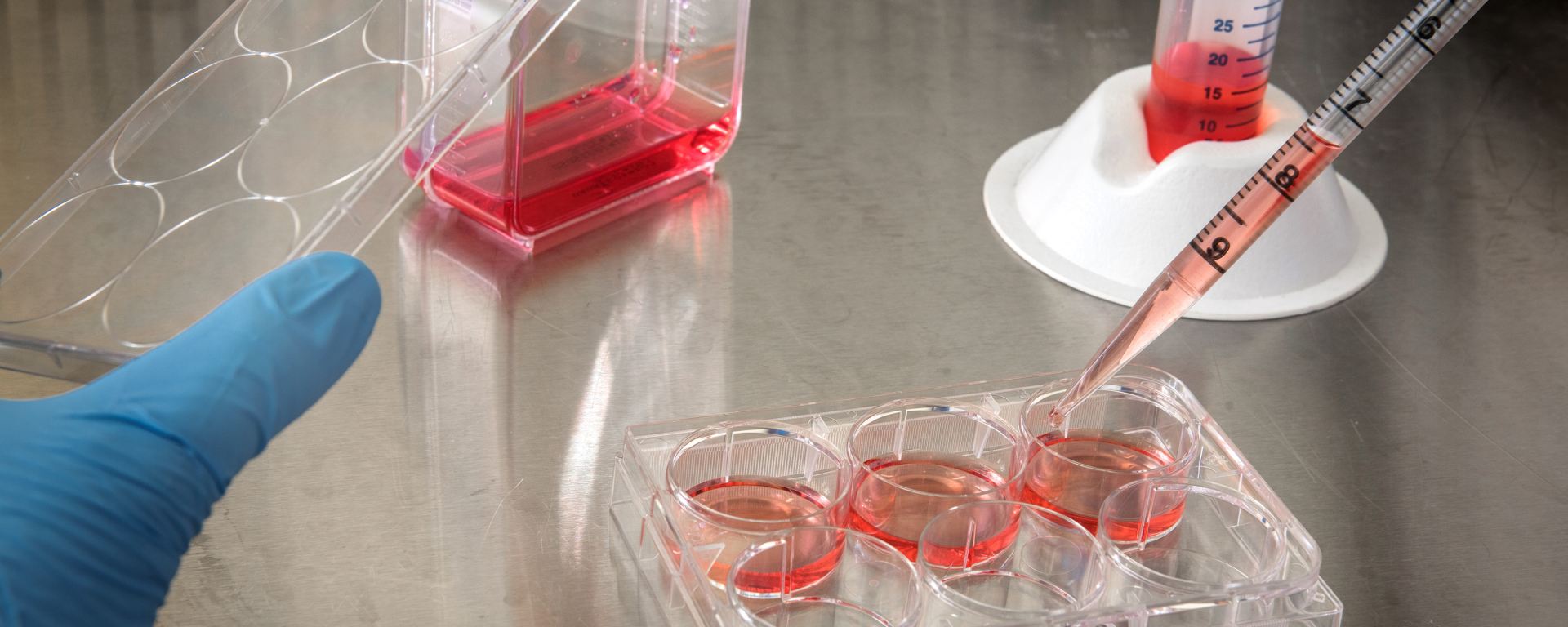 Figure 1 Scientist with blue gloves adding hot pink cell growth medium using a transfer pipette into a six-well plate, with culture flask and centrifuge tube also filled with hot pink cell growth medium in the background.