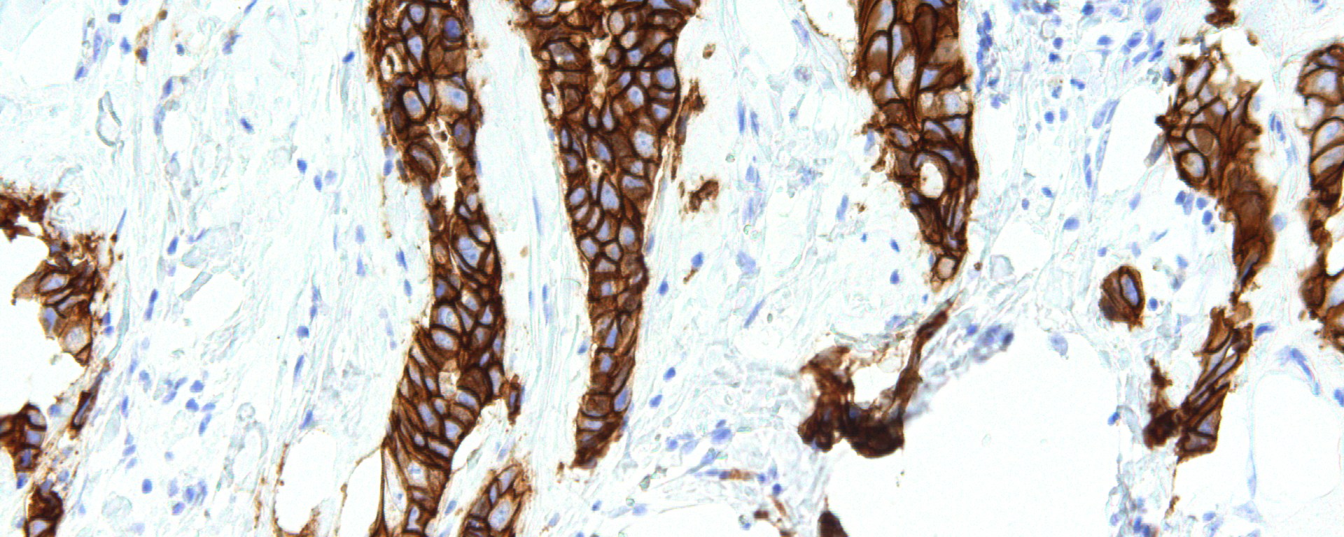 Figure 1. HER2 is a protein that has been strongly implicated in many human cancers, particularly breast cancer, and has been demonstrated to induce carcinogenesis through a variety of different mechanisms. This breast cancer tissue has been stained for HER2.