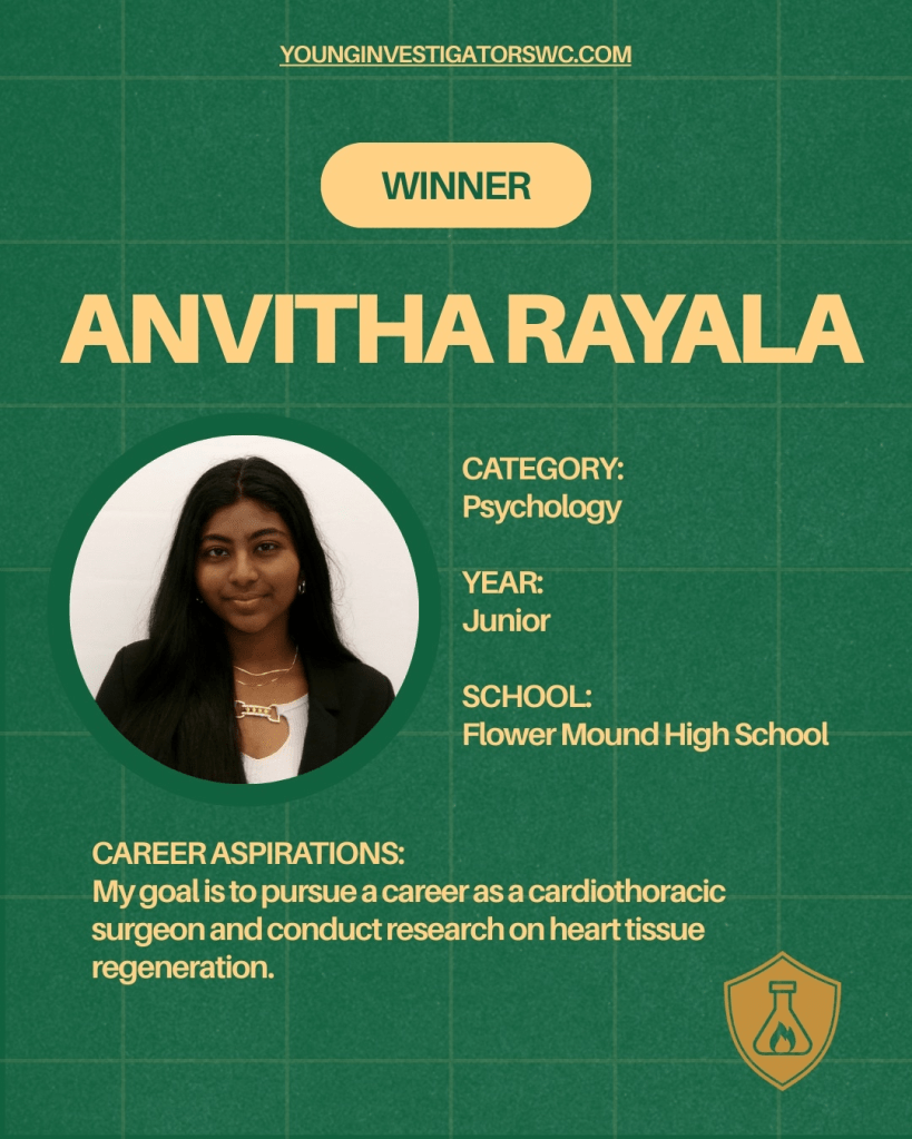 Hailing from Flower Mound High School, Anvitha is an aspiring cardiothoracic surgeon and regenerative medicine researcher.